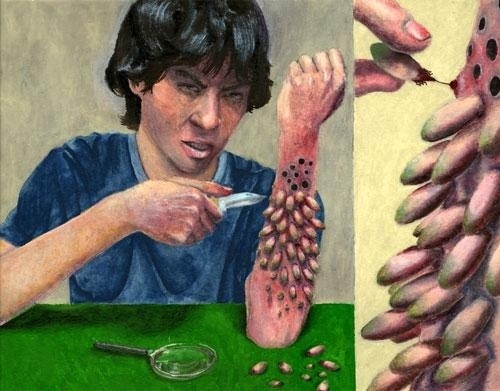freudigen Blicken, wie ich meine Haut und diese scheiß Löcher und Auswüchse