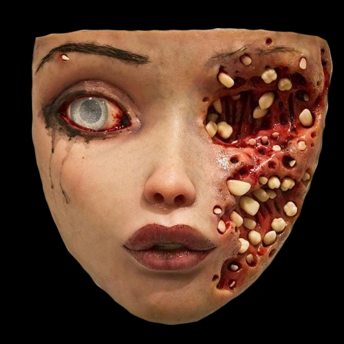 Gesichtern, durchlöchert von oben bis unten, mit kleinen schwarzen Löchern, in